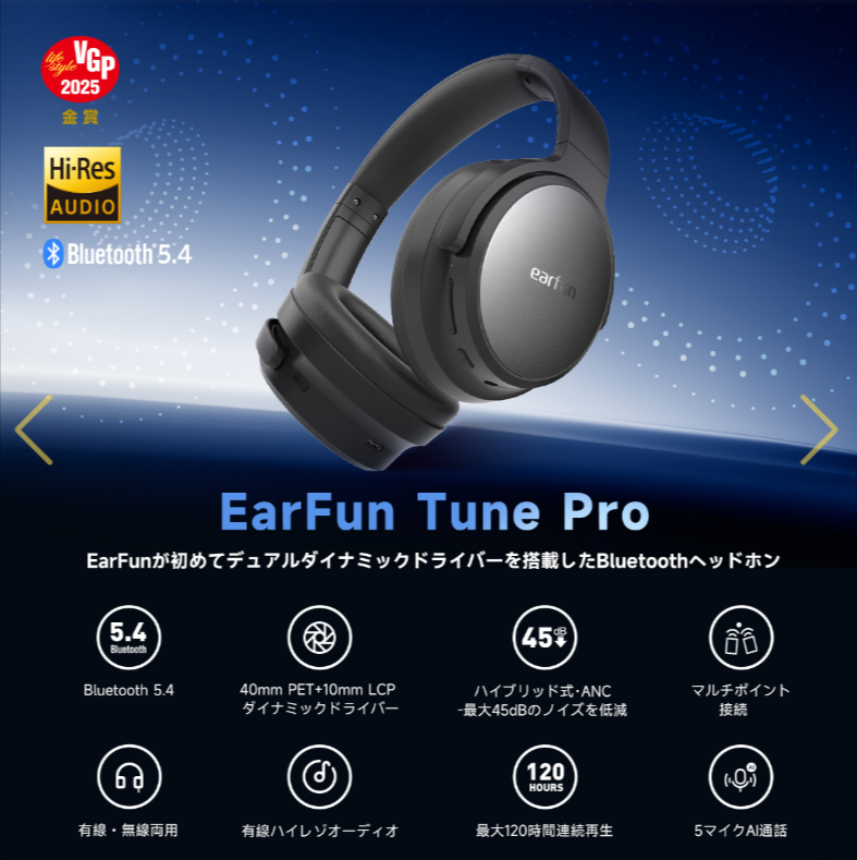 こちらはデザインも素敵なヘッドフォンです。1100mAhバッテリーを搭載しており、なんと120時間連続再生ができるすごいヘッドフォンです!装着感もすごくよくてこちらもシアターモードを搭載しており、劇場のような臨場感を楽しめます!ヘッドフォン好きはお試しあれ!