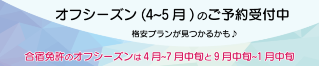 【PR】合宿免許受付センター 長期休みに免許をGETしたい方はこちらへ! こちらは 名前の通り合宿免許受付センターのご紹介です。自動車の運転免許を合宿してお特に、短期間で取得するコースをご紹介しています。 日本全国から申し込みができるので、温泉旅行を兼ねて運転免許を取得するのもよし、 友達と一緒に旅行気分で運転免許を取得するもよし。楽しく最短14日で運転免許が取得できます。 宿泊施設や食事も評判がいいそうです!季節ごとのプランも始まっているのでお得に取得したい方は急いで下さい! オフシーズンは料金が下がり、予約も取りやすいシーズンです!!春休みが終わって4月から7月中旬までのオフシーズンがおすすめ!今なら4月と5月の受付を行っているので空いてるからもう少し後で申込しようではなくて、早く申込した方が確実。入校日の21日前までならキャンセルも無料ですので急いで下さい!! ★自炊コース★・AT車 ¥195,800(税込)~予算を抑えたい方に!★ひとりでおすすめコース★・・AT車 ¥242,000(税込)~気楽に自分の時間も確保したい方に!★グループおすすめコース★・AT車 ¥245,000(税込)~友達とわいわい楽しみながら取得したい方に! 気になるお近くの教習所は下記でチェック↓↓ おすすめ情報 ネット申込がお得♪ 商材名:合宿免許受付センター運営者:m.s※当サイトはアフィリエイトプログラムを利用し宣伝目的で作成しております。