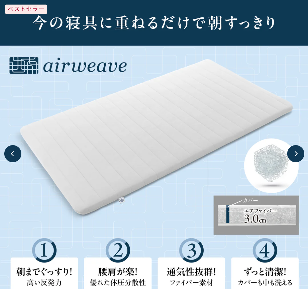 忙しい日々毎日バタバタ。帰ってきたら、体も心も「今日は頑張ったなぁ」と感じる夜にしたいですよね。そんなとき、こちらのマットレスなら、寝具そのものを “ご褒美仕様” にしてくれます。きちんと体を支えてくれる「エアファイバー」が、朝起きたときの肩・腰の “重だるさ” を軽くしてくれます。カバーも中材も丸洗いできるから、子どもと川の字で寝ても「汚れたかも…」とヒヤヒヤしなくて大丈夫。「寝る時間が好き」って思える、そんな寝具です。