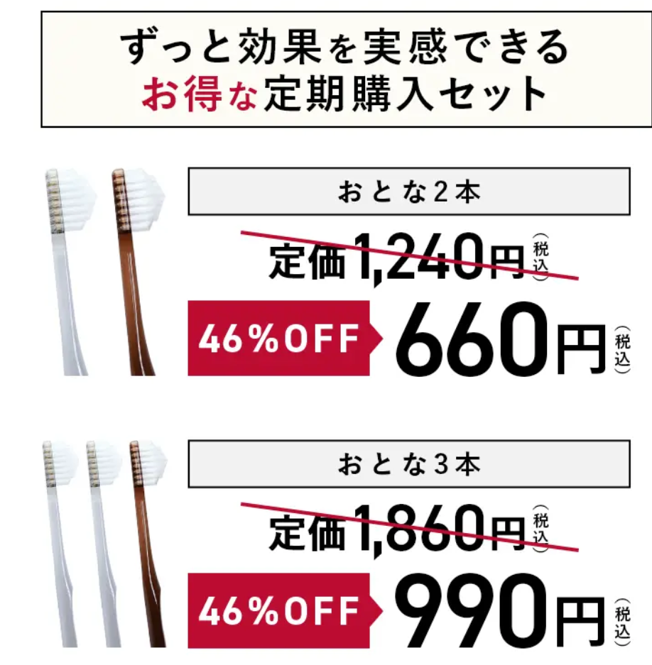 歯ブラシというのは使い続けないと効果が実感できないと思います。こちらの歯ブラシは1本使ってみたら次もまたこの歯ブラシにしようと思えますので是非定期購入がおすすめです!!定期購入ならずっと46%OFFで受け取りもポスト受け取りなので簡単♪購入の縛りや回数制限等もないので始めやすい!交換する際に買い忘れていたという事もないのでいつでもキレイな歯ブラシが使えます。もちろん合わないなと感じたら使用後でも25日間全額返金保証もあるので大丈夫♪