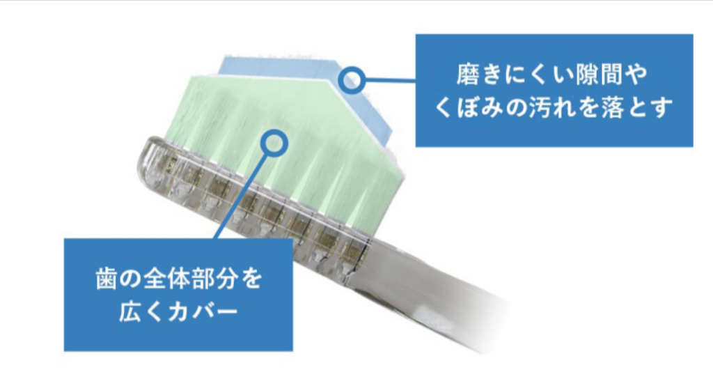こちらの歯ブラシは均一の植毛タイプではなく、2段に分けて長さの異なる毛を植毛・カットしています。ブラシを2段に分けることによりブラッシングの役割を分担し、高さ1.9mmの高低差がブラッシングに差をつけます。